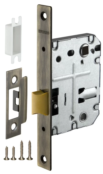 Дверная защелка с пластиковым механизмом Fuaro P72 серии PLASTIC изготовлена в соответствии с требованиями ГОСТ 5089-2003. Предназначена для установки в деревянные межкомнатные двери. Легкая смена направления язычка защелки, подходит для дверей левого и правого открывания. Корпус выполнен из стали с надежным гальваническим покрытием. Ударопрочный пластиковый механизм обеспечивает бесшумность работы защелки. Защелка P72 с усиленным блоком пружин имеет высший 4 класс надежности (250 000 циклов открывания/закрывания). Отверстия под стяжные винты находятся на расстоянии 35-41 мм. Размер бэксета - 50 мм. Размер межосевого расстояния - 70 мм. Возможна установка дверных ручек на стяжные винты для более прочного крепления. Цвет: бронза. В комплектацию входят: ответная планка с декоративной вставкой и крепежная фурнитура в цвет изделия.